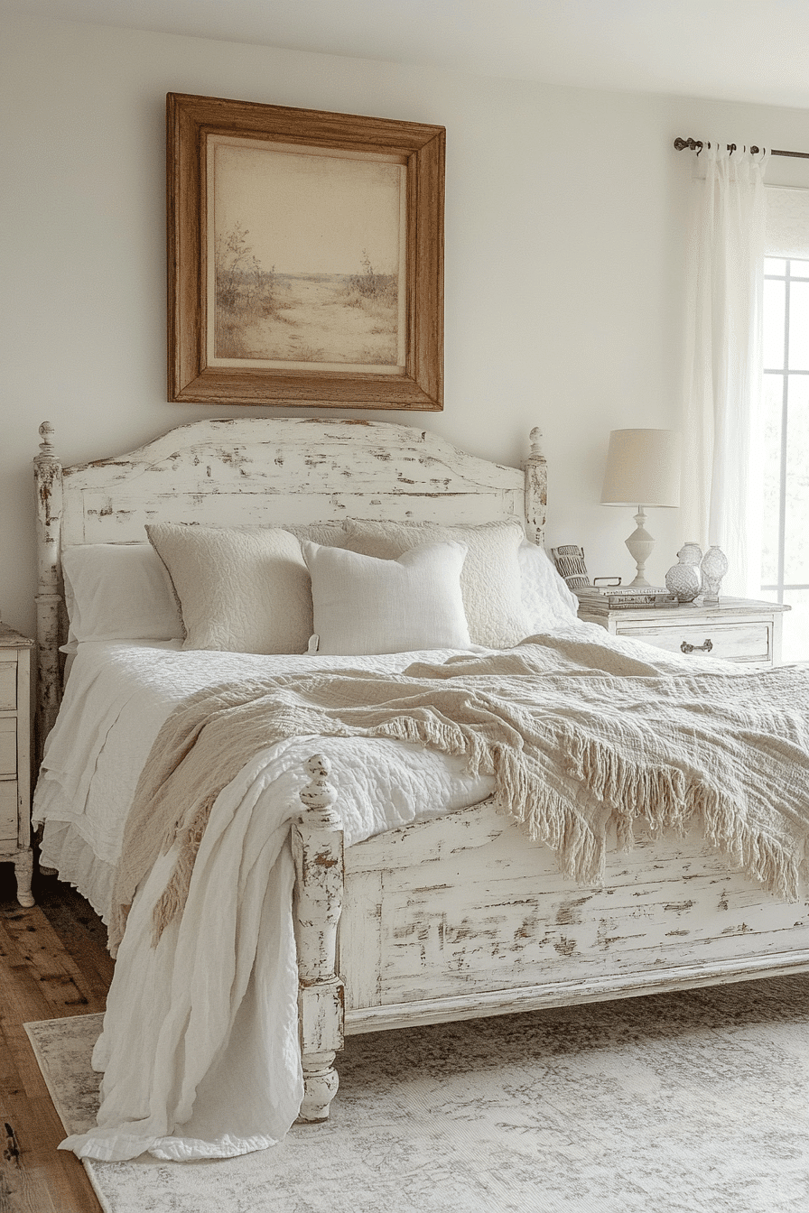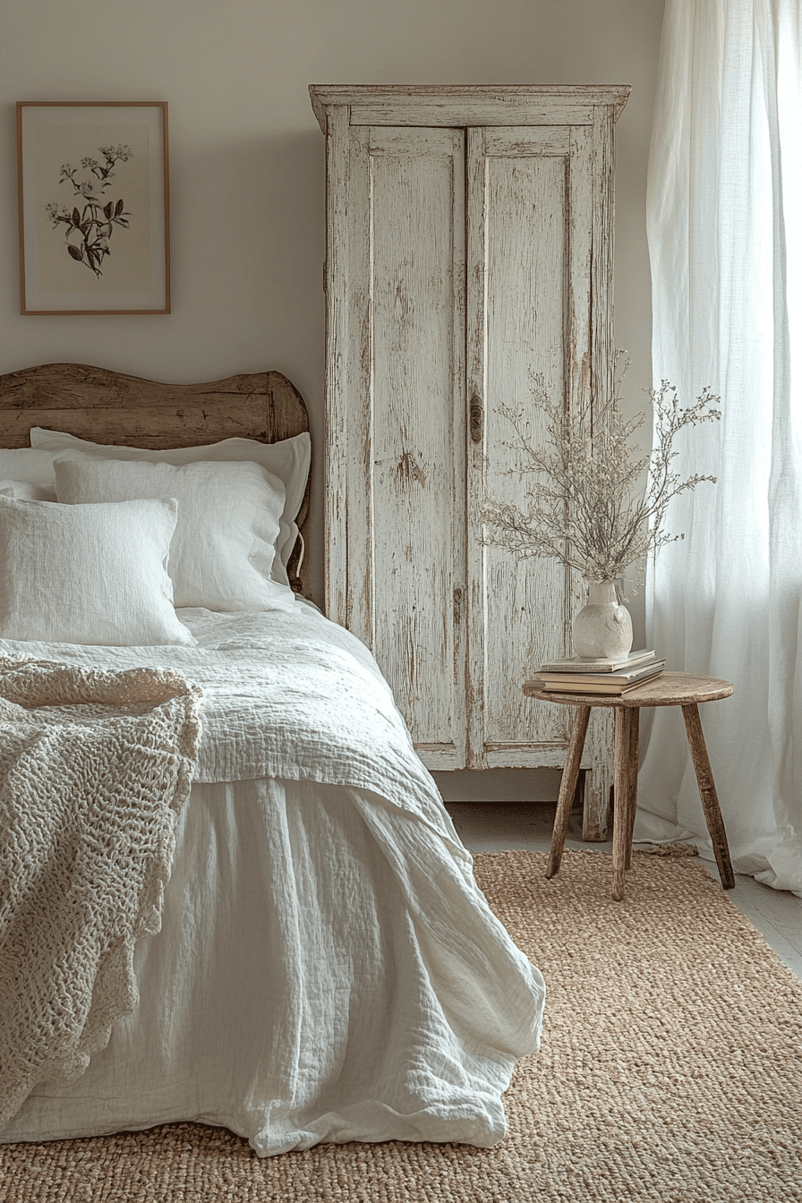 Whitewashed furniture and decor create an ethereal softness in a vintage shabby chic bedroom. This finish lightens wooden pieces without erasing their texture or history. It works wonderfully on headboards, dressers, and side tables. Paired with pale bedding and soft drapes, the room feels bright, quiet, and serene. The result is effortlessly romantic. Tap now to explore whitewashed whispers for your own sleep sanctuary.