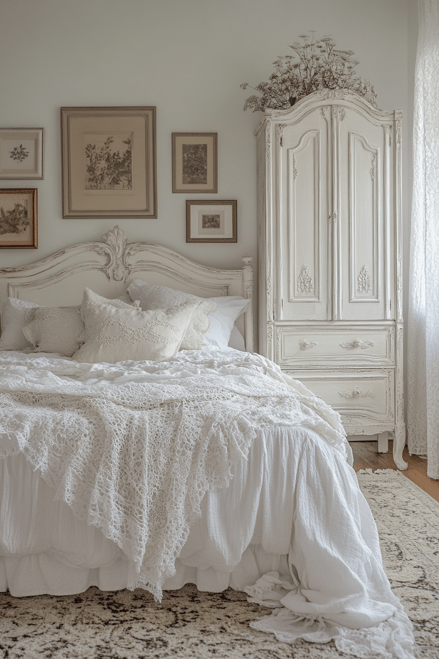 Soft white furniture with graceful curves adds timeless appeal to a vintage shabby chic bedroom. Look for headboards, dressers, and side tables with subtle carvings and a matte white finish. The light tone reflects natural light and softens the overall space. Layer in ruffled bedding and embroidered fabrics for texture. This style captures purity and romance in every detail. Click to discover soft white silhouettes for your space.