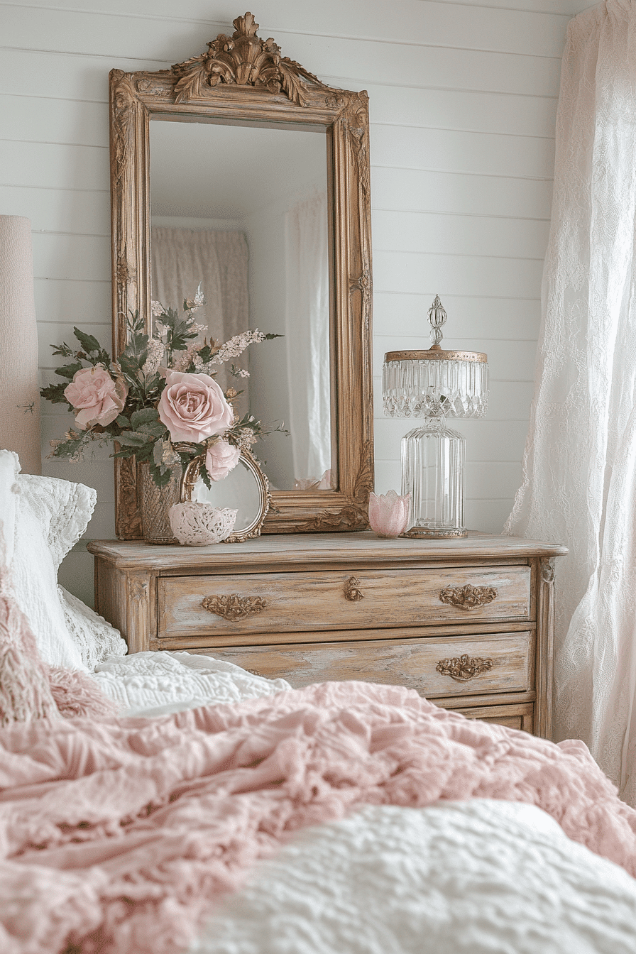 Ornate mirrors bring vintage drama and elegance into a shabby chic bedroom. Whether gold-toned, whitewashed, or silver-leafed, they reflect light beautifully. Placed above a bed, dresser, or vanity, they become a subtle statement. The details in the frame add a touch of grandeur. They’re practical and decorative all at once. Tap here to see more mirror styling moments.