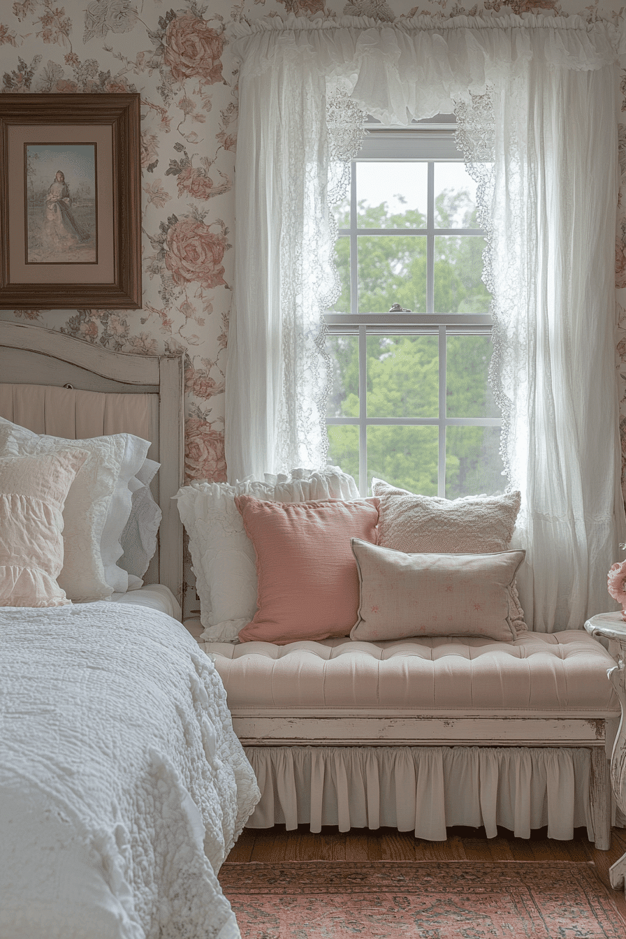 A cozy nook filled with vintage touches creates the perfect quiet escape in a shabby chic bedroom. Use a cushioned bench, soft throw, and distressed side table to define the space. Add lace curtains or a soft light for charm. Keep the palette light and consistent with the room. It’s a small area with big personality. Click to find whimsical nook inspiration!