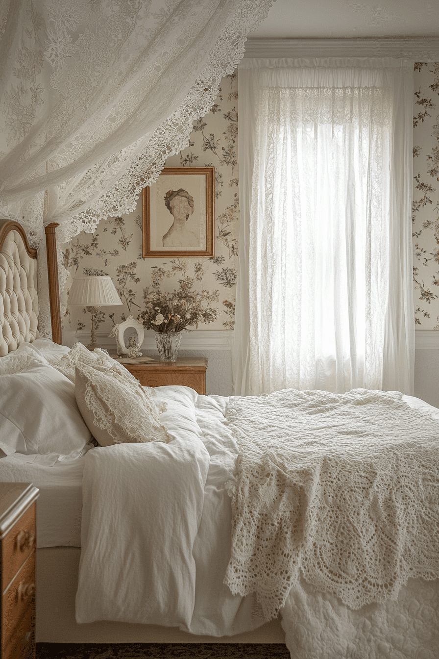 Lace adds delicacy and texture to any vintage shabby chic bedroom design. Whether used on curtains, pillows, or duvet trims, it softens the space with graceful detail. White or cream lace feels especially timeless when layered over pastel bedding or painted headboards. Its sheer quality lets light filter through beautifully in the morning. The overall effect is feminine, cozy, and inviting. Tap to explore more soft lace escapes for your bedroom.