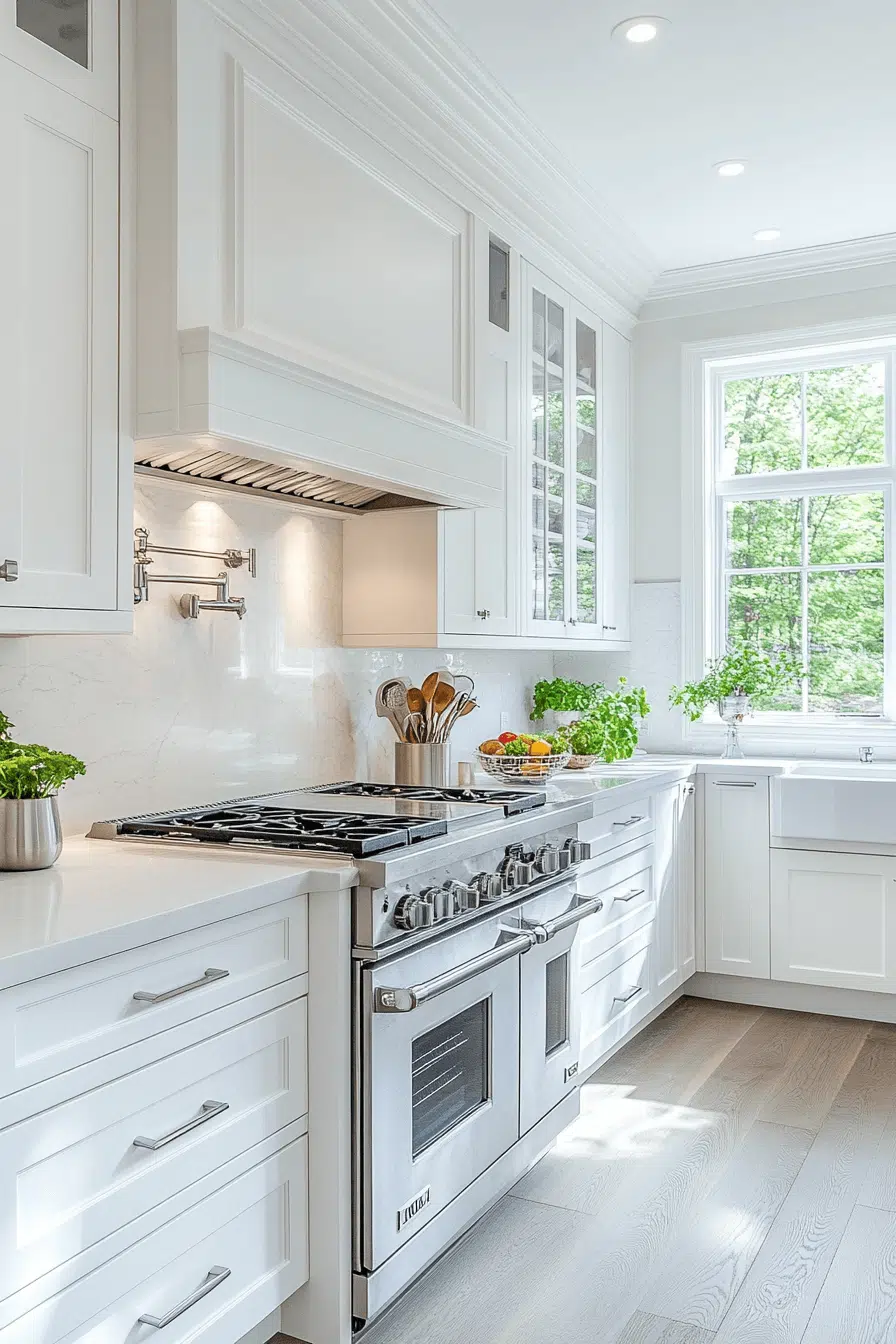 Nordic Luxe combines Scandinavian functionality with elegant white finishes for a white kitchen that feels both warm and clean. Pale wood accents or stone countertops soften the brightness. The look emphasizes utility without sacrificing beauty. It’s cozy yet elevated, simple yet rich. The design is deeply livable and stylish.