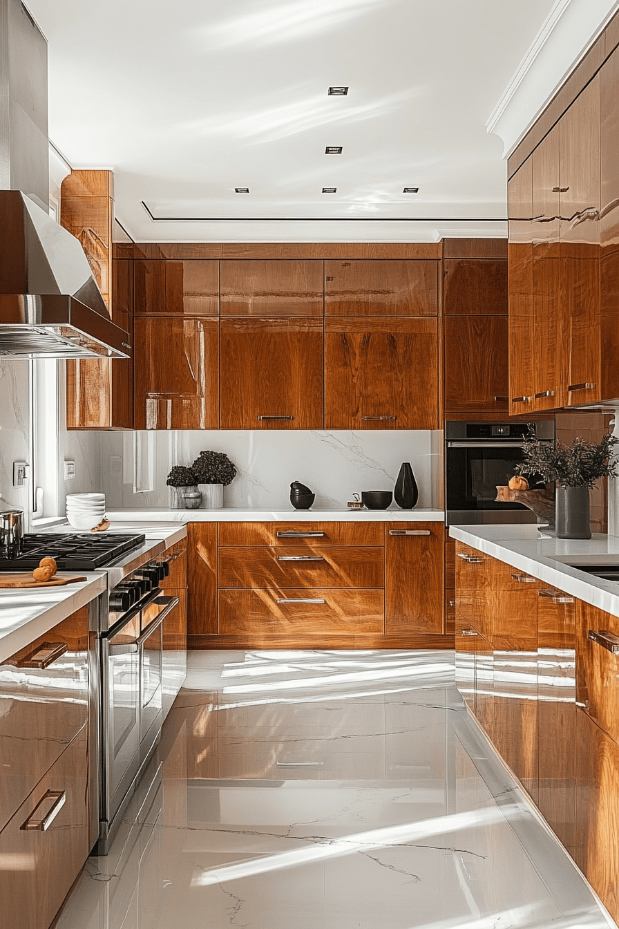 Polished wood kitchen cabinets create a smooth and contemporary aesthetic. Their clean surfaces are ideal for kitchens aiming for a minimalist style. Wood’s natural grain keeps the space from feeling too sterile. This balance of sleekness and warmth makes the kitchen both functional and inviting. It’s a look that adapts easily to changing trends. See more sleek wood cabinet looks today!