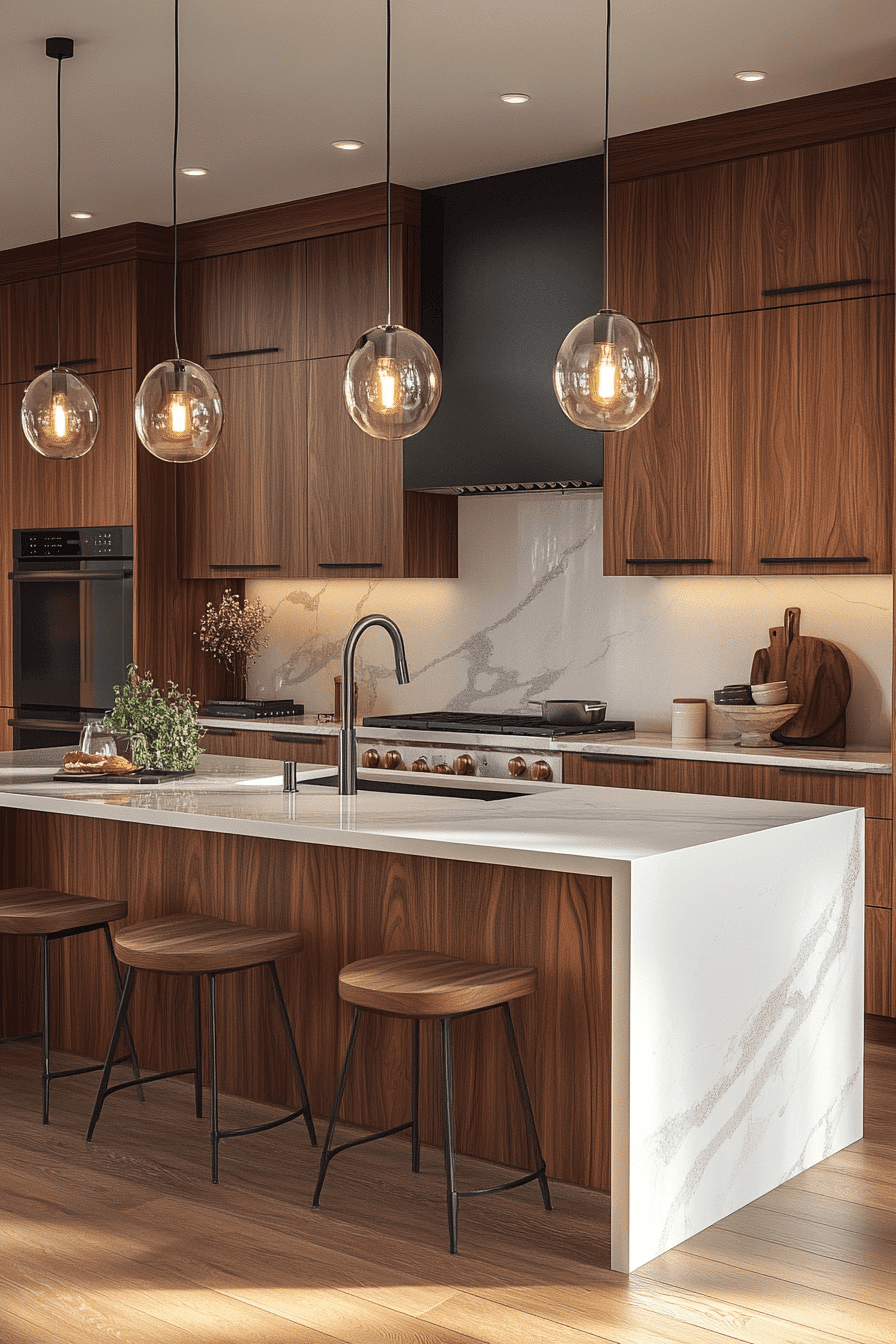 There’s something deeply satisfying about a kitchen that feels both grounded and elevated; the walnut here wraps you in warmth while that crisp waterfall edge keeps everything feeling sharp and intentional.
