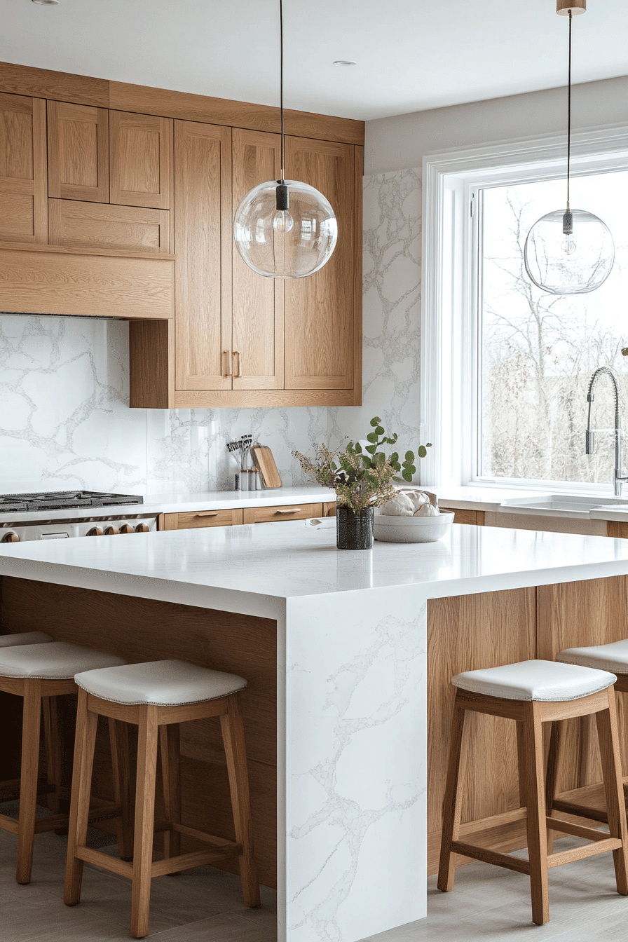 This kitchen feels like the kind of space where you’d actually want to linger over morning coffee, not just rush through meal prep—the warmth of the wood keeps the marble from feeling too cold or hotel-like.