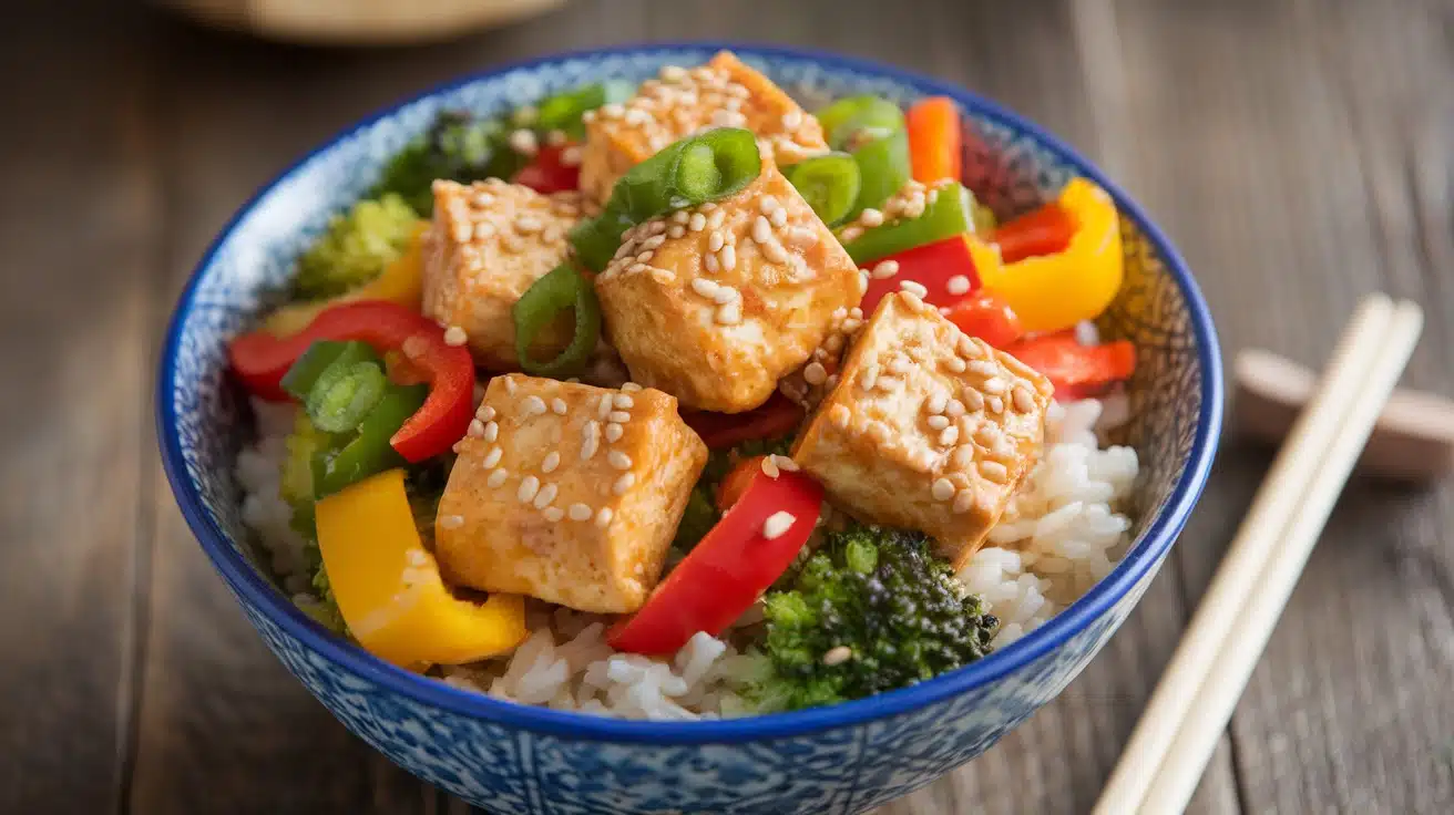 - Assemble the Bowls: In serving bowls, place a scoop of rice, top with the sesame tofu, and add a mix of fresh vegetables.