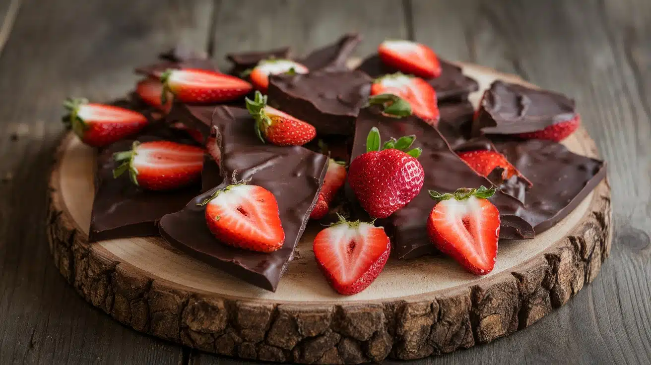 This Dark Chocolate Strawberry Bark features a rich, smooth dark chocolate base combined with the natural sweetness of fresh strawberries. Each bite offers a delightful contrast between the creamy chocolate and the fruity tartness, making it an irresistible snack.