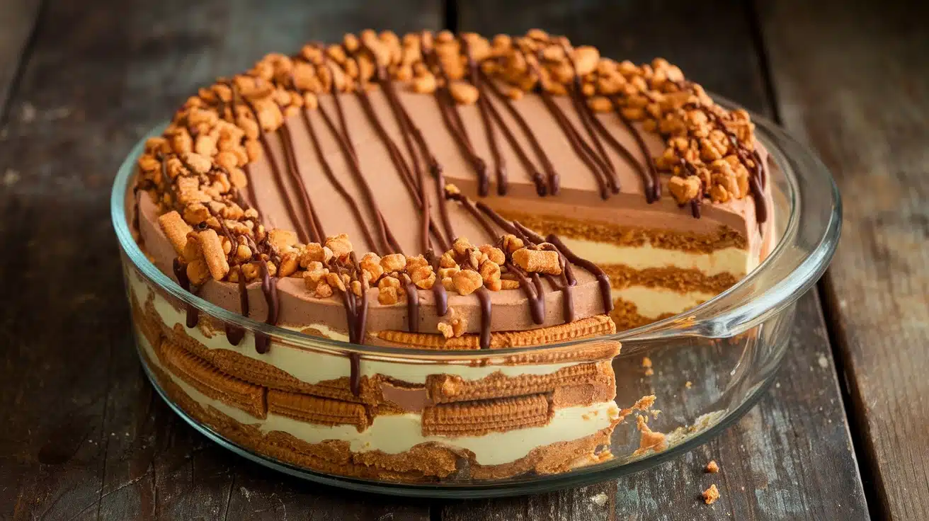 This No-Bake Layered Biscoff Cookie Delight features crispy Biscoff cookies layered with a rich cream cheese and whipped topping filling, all topped with chocolate drizzle. The taste is an exquisite balance of sweet, buttery flavors with a hint of spice from the cookies, making it an irresistible dessert for any occasion.