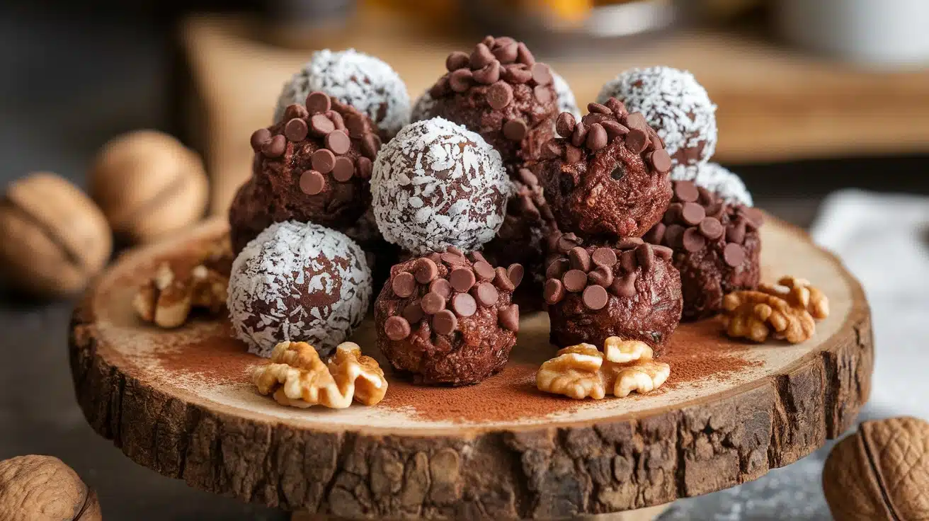 A plate of No-Bake Brownie Bites on a wooden platter, garnished with coconut and chocolate chips.