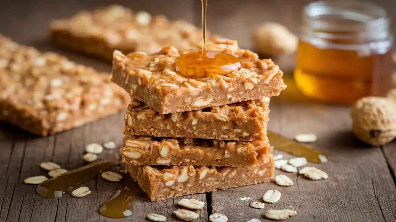 Nutty no-bake peanut butter and honey oat bars on a wooden table with honey and oats.