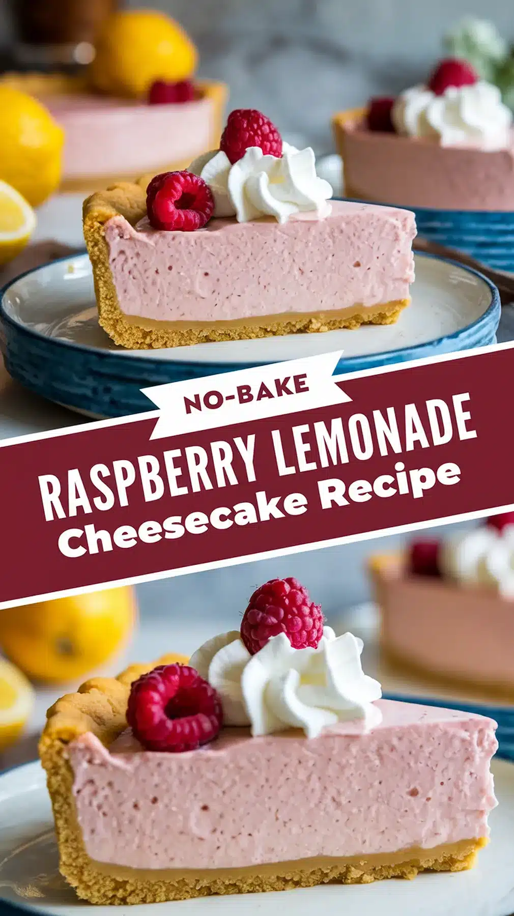 The No-Bake Raspberry Lemonade Cheesecake features a smooth and creamy filling made with cream cheese, whipped cream, and tangy lemonade, all nestled in a buttery graham cracker crust. The fresh raspberry topping adds a vibrant burst of flavor and color, making this dessert as pleasing to the eyes as it is to the palate.