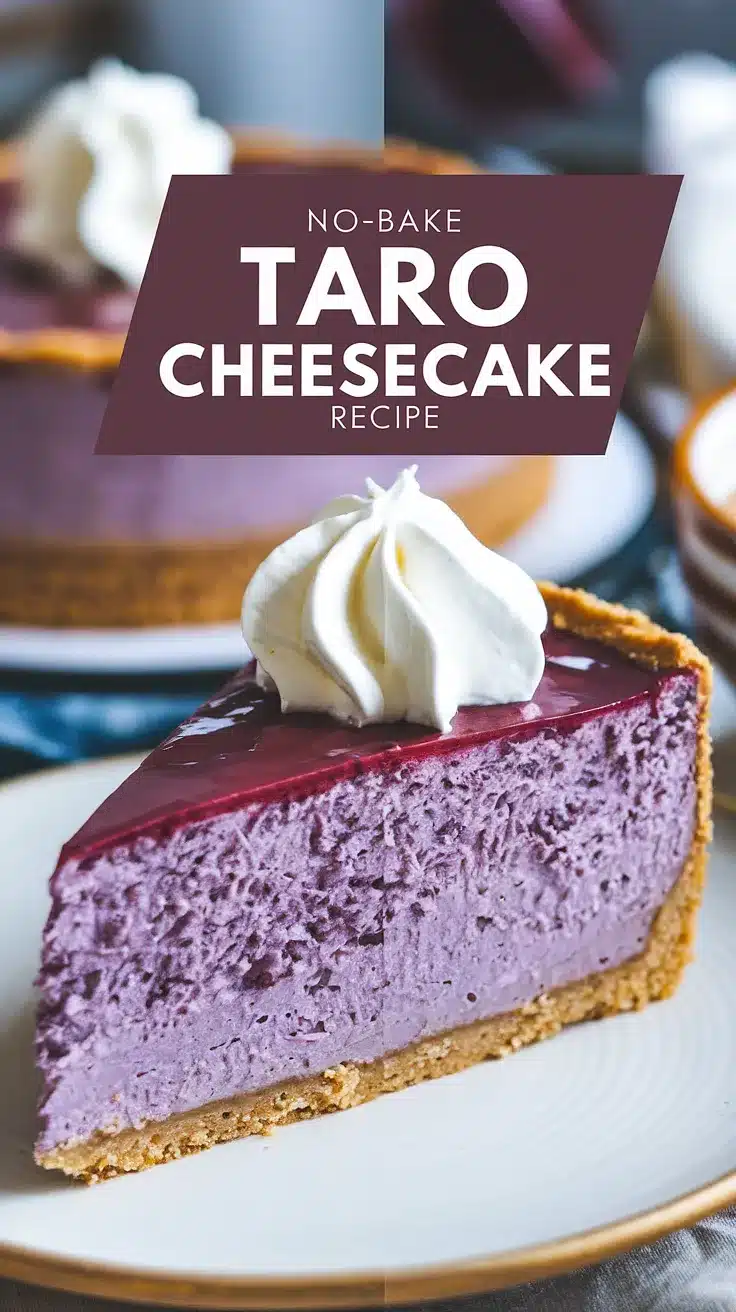 - Serve: Once set, carefully remove the cheesecake from the springform pan. Garnish with fresh taro slices if desired, slice, and enjoy your No-Bake Taro Cheesecake!
