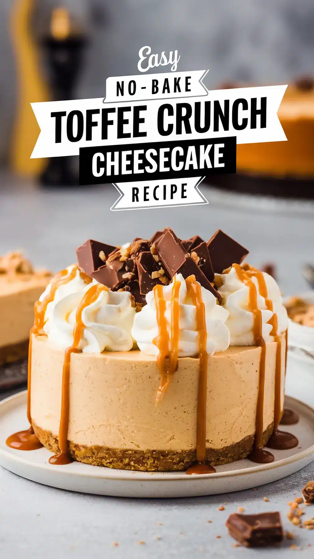 This No-Bake Toffee Crunch Cheesecake is a creamy and luscious dessert that features a crunchy toffee topping. It’s rich, sweet, and perfect for satisfying your dessert cravings without the hassle of baking.