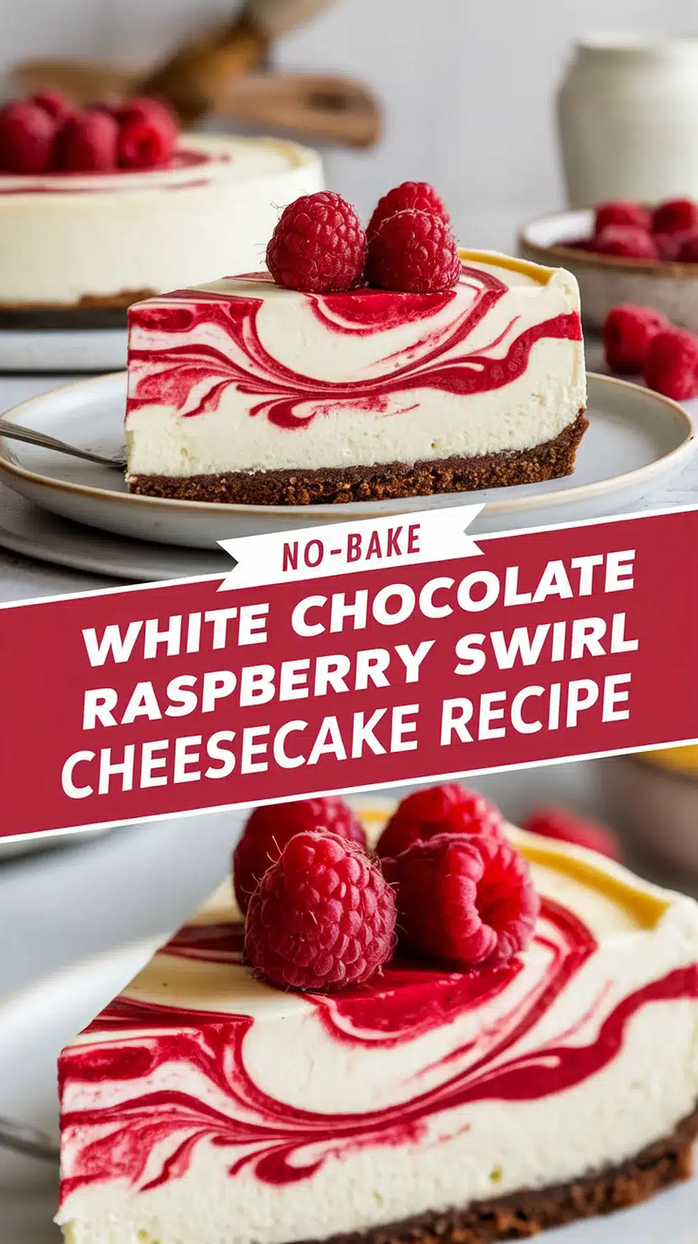 The No-Bake White Chocolate Raspberry Swirl Cheesecake features a luscious white chocolate filling that is both creamy and indulgent. The raspberry swirl adds a vibrant pop of color and a tangy contrast that elevates the overall taste.
