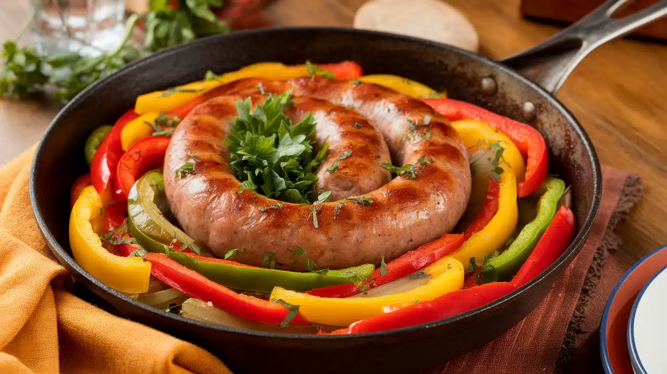 This One-Pan Sausage & Peppers Recipe features flavorful sausages, vibrant bell peppers, and onions, all cooked together for a satisfying meal. With its savory taste and easy preparation, it’s perfect for busy weeknights or casual family gatherings.