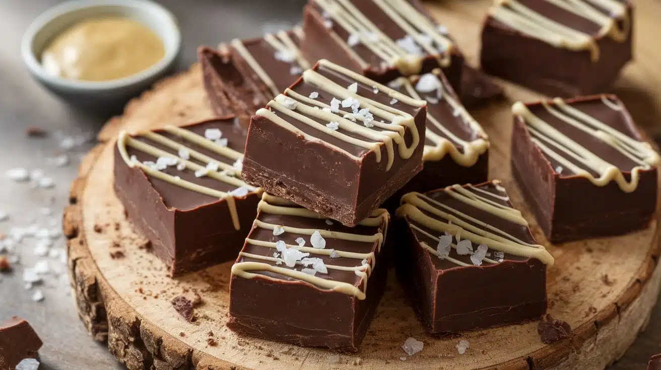 Decadent dark chocolate fudge squares with tahini, garnished with sea salt, on a rustic wooden board.